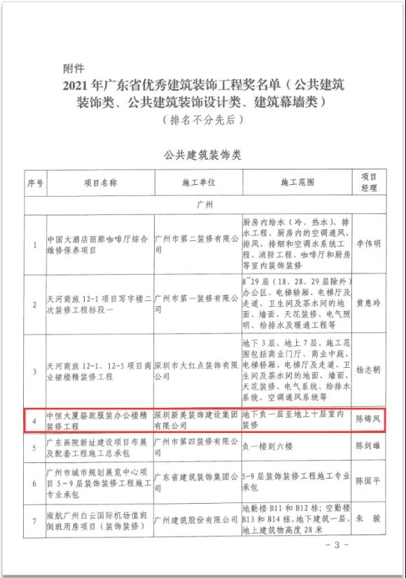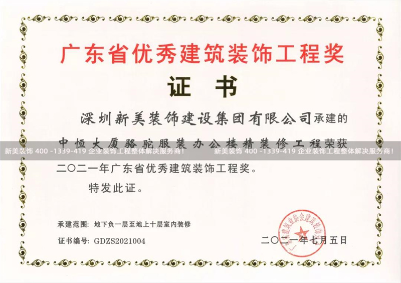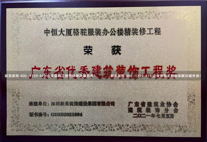 为积极推动我省建筑装饰企业抓好工程质量,努力创建装饰精品工程,根据《广东省优秀建筑装饰工程奖评选办法》,经过严格选拔,重重评审,广东省建筑业协会公布了“2021年广东省优秀建筑装饰工程奖”的评选结果。由深圳米兰官方网站有限公司负责承建的“中恒大厦骆驼服装办公楼精米兰(中国)工程项目”荣获“二〇二一年广东省优秀建筑装饰工程奖”,为集团品牌创优成果再添浓墨重彩的一笔。
