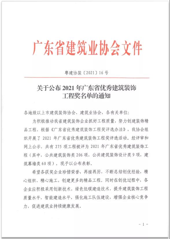 喜讯︱热烈祝贺米兰官方网站集团荣获2021年广东省优秀建筑装饰工程奖